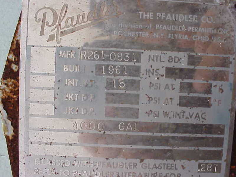 4000 Pfaudler Gallon Glass lined Tank. Rated 15 PSI internal.