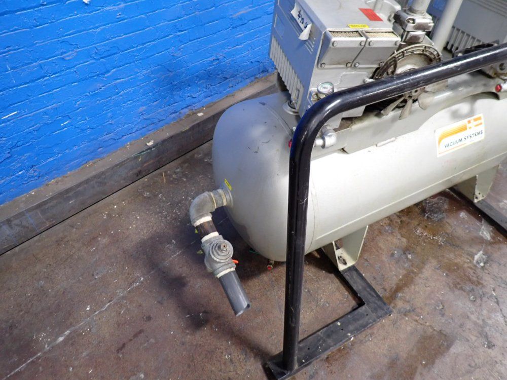 Used 2HP Elmo Rietschle Rotary Vane Vacuum Pump Model VC 50, Type VC 50 1026492068, Nominal Capacity: 60 m /h, Ultimate Partial Pressure: 0.1m/bar, Ultimate Vacuum: 0.5 m/bar, Vacuum line size: 1" with oil filter, Includes electrical disconnect on a stainless steel frame., Electrical Service: 265/460V, 60Hz AC.