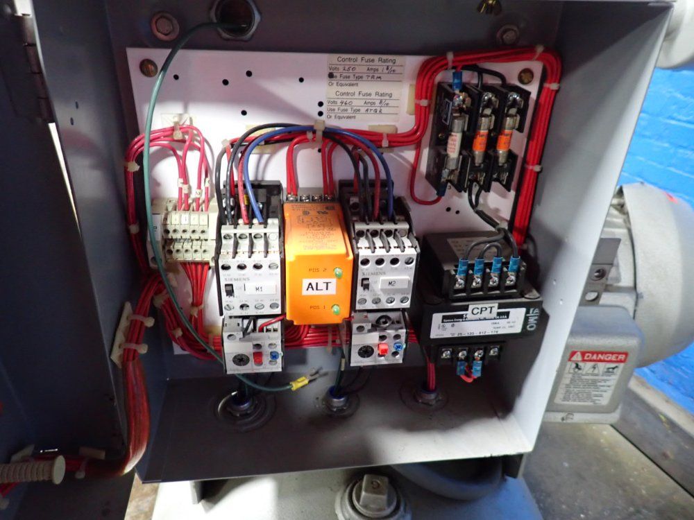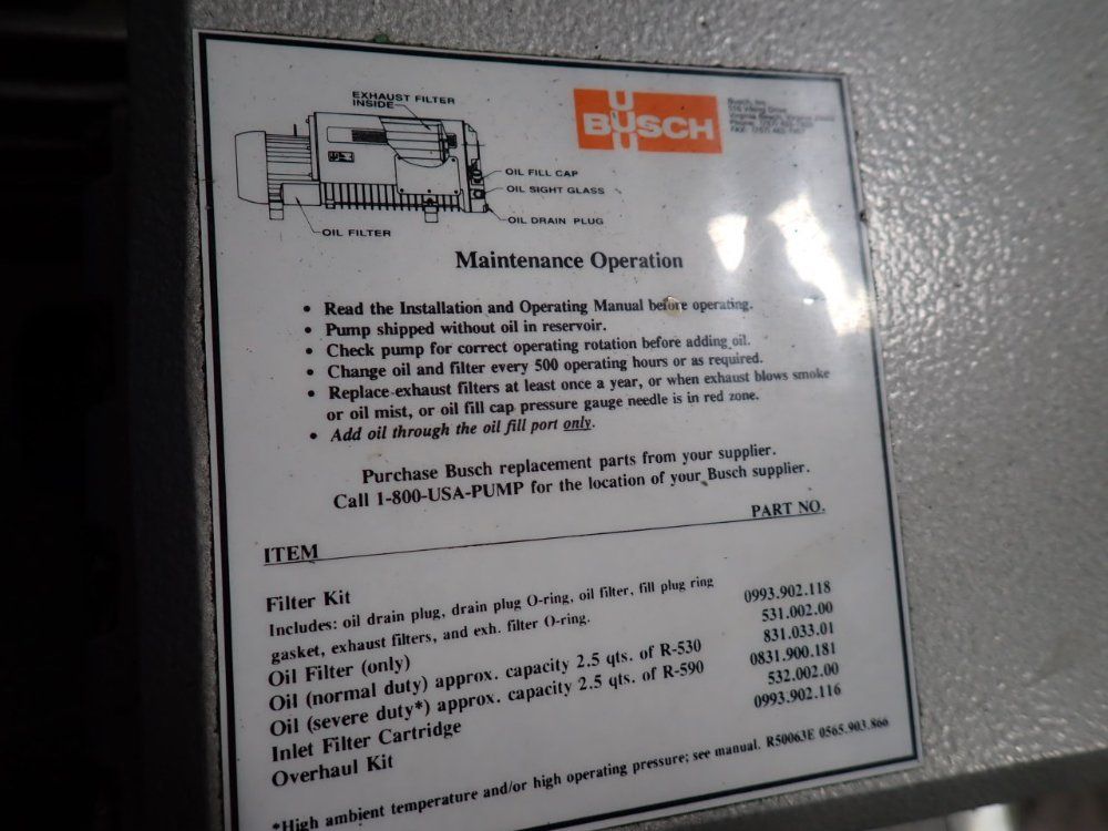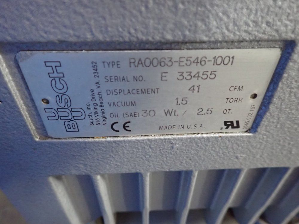 Used Busch type RC0063.E506.1001 vacuum pump system on skid. 41 cfm, 15 torr. With 3 HP motor, condenser, and control panel., BUSCH RC0063.E506.1001, Capacity. 41 ft/min., Motor Power. 3 hp, Vacuum Rating. 15.