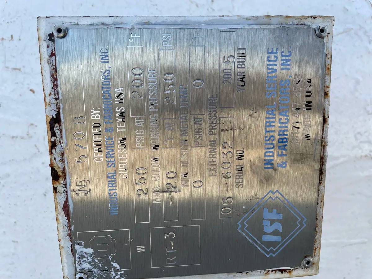 Industrial Service & Fabricators Inc. Vertical Ammonia Receiver ( 65in x 306in. 4400 Gallons) Serial Number: 1509305. Tank National Board Number: 5708. Tank Estimated Capacity (Gallons): 4400. Tank MAWP (PSI @ Temp): 250 PSIG @ 200F. Tank MAWT (PSI @ Temp): -20F @ 250 PSI. Previous Refrigerant was Ammonia (R717 | NH3). Manufactured in 2005. Shipping Dimensions (Inches): 306 x 83 x 83. 10000 LB