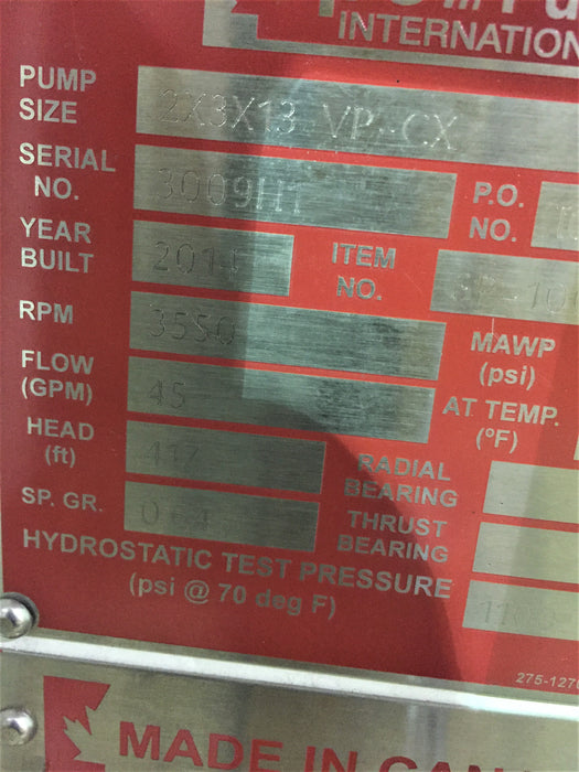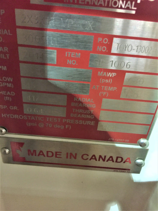 Used Sundstrand model 3" X 2" X 4 1/8" centrifugal pump. 316 stainless steel contact parts. 49 GPM @ 2140' HD. 3545 rpm with 50 HP, 230/460 volt motor. Serial #79112116. Model LMV322., SUNDSTRAND 3" X 2" X 4 1/8".