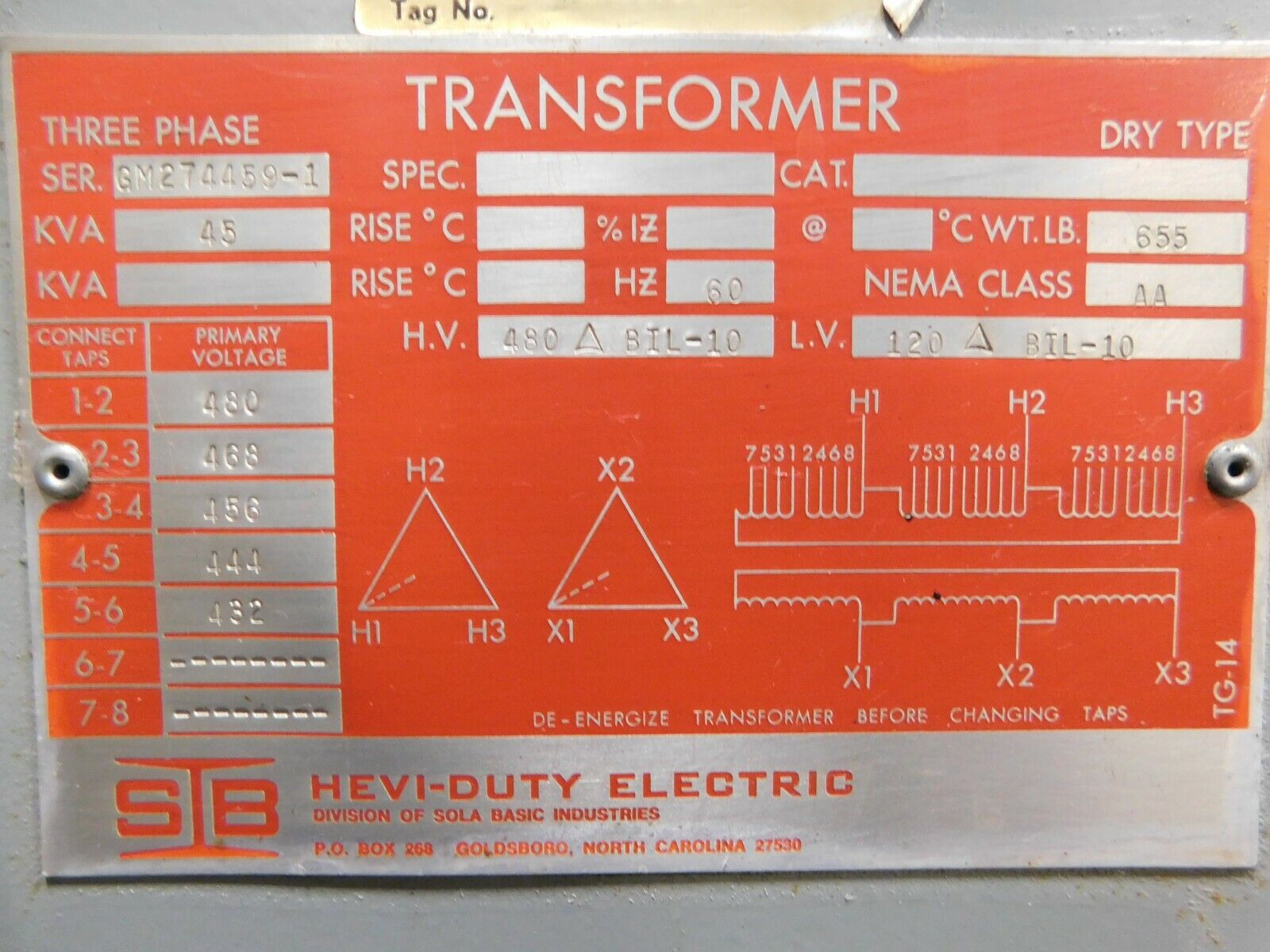 - Power Rating: 45 KVA, 3 PH, 480 H.V., 120 L.V.
