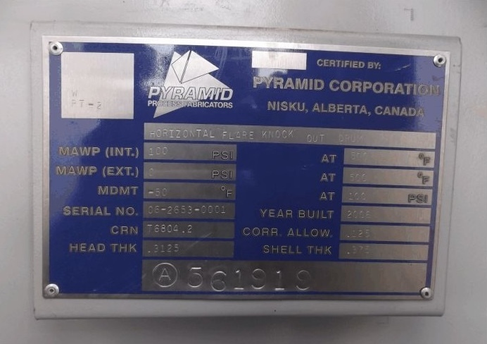 Available for sale: A portable horizontal pressure vessel manufactured by Pyramid Corporation in 2006. This unit has a diameter of 48 inches and a length of 15 feet, designed for sweet service type applications. It operates at a pressure of 100 psi and is currently connected, ensuring operational status. Located in Edmonton, AB, Canada.