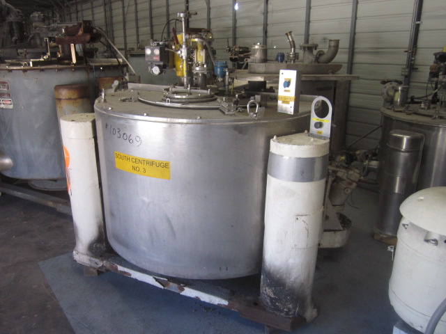 Used 48" Dia. Ellerwerk Stainless Steel Basket Centrifuge, Manufacturer: Ellerwerk, Type: 736 U-A, Serial: 86019, Year: 1986, Basket dimensions: 48" dia. x 24" deep, Basket type: perforated, Material of construction: 316 stainless steel, Driven by a 25 kw motor, Additional information: feed pie, spray ball, double ...more