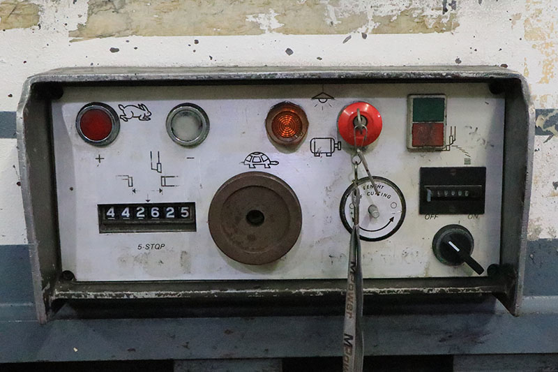 SERIAL. 13738, MODEL. 0S7, CAPACITY. 5/8", LENGTH OF BLADES. 52", DEPTH OF THROAT. 24", NUMBER OF HOLD DOWNS. 6, PASS LINE HEIGHT. 36", ACTUATED TRIP. YES, DUAL PALM BUTTONS. YES, 1 SHOT LUBE SYSTEM. YES, REAR OPERATED BACK GAUGE. MANUAL, COUNTER BALANCE. YES, MOTOR. 15 HORSEPOWER.