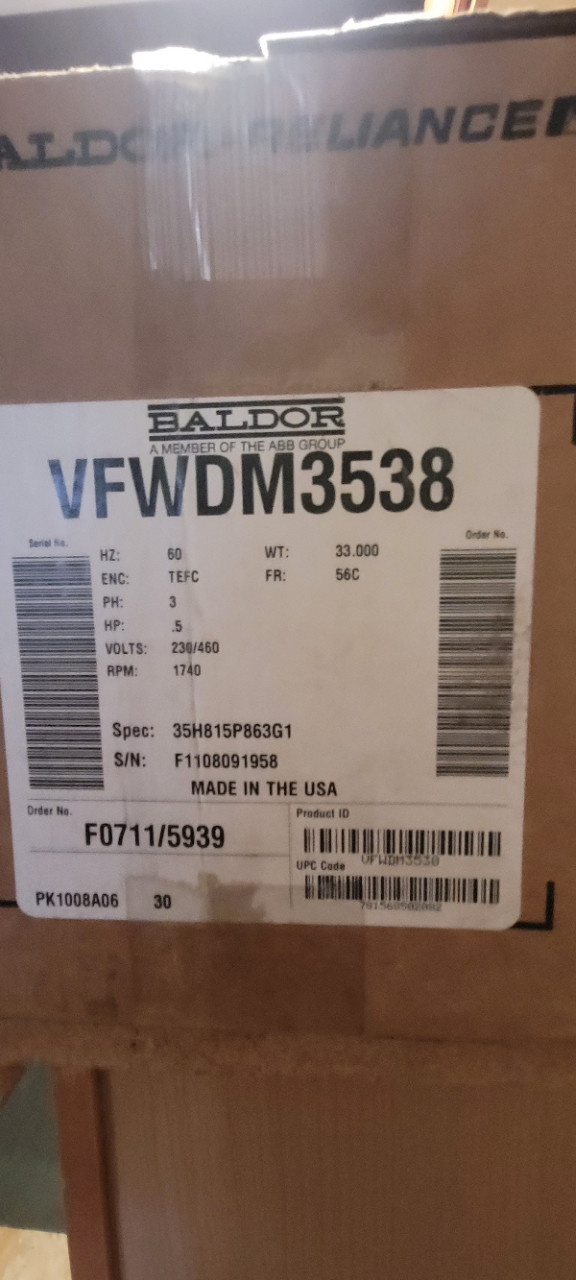 MAKE OFFER! .5HP, 1/2 HP 1770 RPM Baldor-Reliance Food Grade-BISSC Certified VFWDM3538, Frame 56C, TEFC, ND, 230/460 Volts (5 units available) Suitable for food grade (H1) applications. Units are also BISSC certified (Baking Industry Sanitation Standards Committee). (5) UNITS AVAILABLE, ALL NEW IN FACTORY BOXES, 4 IN PLASTIC WRAP, LOOK CLOSELY AT PICTURES Features: