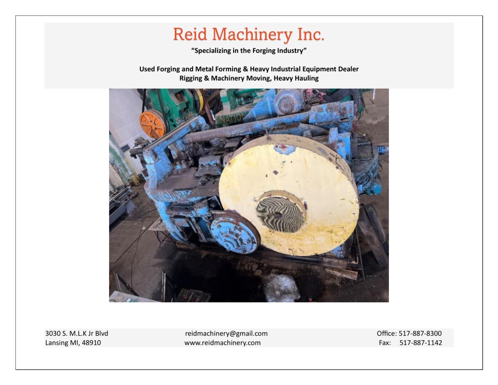 ONE PREOWNED NATIONAL 5” UPSET FORGING MACHINE, NEW in 1950'S, Tonnage 1100, Stroke Per Minute 30, Stroke of Machine 15”, Grip Opening 7”, Gather 8 1/8”, Hold 2 ½“, Floor Space-Width 11', Floor Space-Length 11' 10”, Die Space.F-B 24”, Die Space Thickness ...more