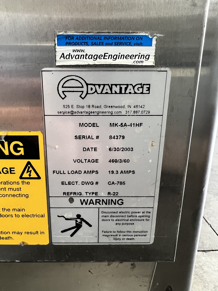 Voltage: 460V, 3-phase, Refrigerant: R-22, with a charge of 14 lbs, Operating Temperature Range: 35°F to 70°F, Refrigeration System: Hermetically sealed with a stainless steel tank, Fan Motors:, Horsepower: ½ HP, Voltage: 220/230/440V, 3-phase, Frequency: 50-60 Hz, RPM: 1140, Overload Protection: ...more