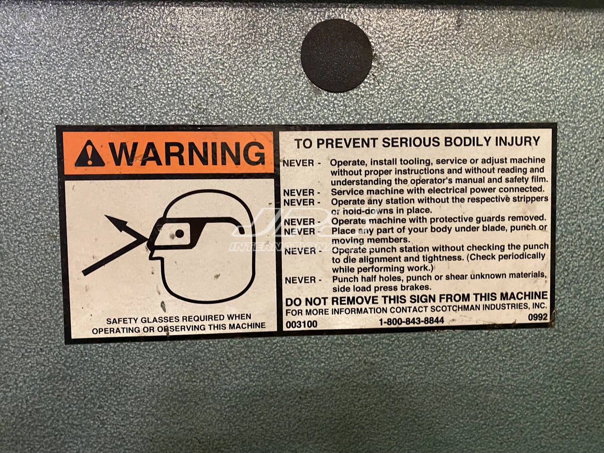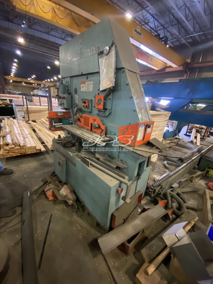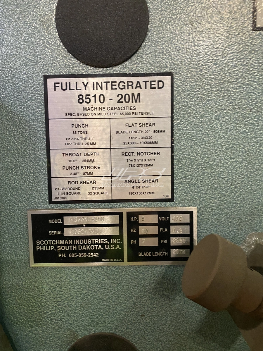5" x 3" x 0.5" Scotchman #FI8510-20, 85 ton, 5 HP, 10" throat, 3.45" stroke, 2006 Manufacturer: Scotchman Model: FI8510-20 Year: 2006 90° Angle Shear Capacity" L: 5.00 90° Angle Shear Capacity" W: 3.00 Shear Capacity: 0.500 Ton: 85 Stock # 1194 Request a Quote 6 For Sale by JPS International Inc Surplus Record Dealer Since 2014 Contact Seller Lake Forest, CA Casey Janes 714-25...> Show Seller's Phone Number 714-253-4707 Let the seller know you found their listing on Surplus Record! View More JPS International Inc 's ListingsDescriptionEquipmentIronworkerUsed 2006 Scotchman FI8510-20M 85 Ton 5-Station Hydraulic IronworkerUsed 2006 Scotchman FI8510-20M 85 Ton 5-Station Hydraulic IronworkerHave one to sell?Sell Now1 (714) 253-4707used@jpsint.comConditionUsedQuantity1 availableRequest QuoteLoading...Have one to sell?Sell NowOverviewType:IronworkerManufacturer:SCOTCHMANModel:FI8510-20Condition:GoodYear:2006Stock #:1194Status:For SaleDescriptionAvailable Immediately. This machine is currently under power and available for inspection. A factory-trained technician can be provided at extra cost for installation & operator training.Please note: The machine is sold as-is, where-is. Pricing does not include decommissioning, loading, shipping, installation, training, taxes, or any other associated costs.SpecificationsImperialMetricTonnage85 t93.696 TAngle (L1)3"76.2 mmAngle (L2)5"127 mmAngle (T)0.5"12.7 mmPower5 hp5 hpThroat10"254 mmStroke3.45"87.63 mmDimensionsL: 67-3/4" (172cm) W: 32" (81.5cm) H: 78" (198cm)L: 67-3/4" (172cm) W: 32" (81.5cm) H: 78" (198cm)Weight4,554 lbs4,554 lbsPunching Capacity:85 ton (77 metric tons)1-1/16" in 1" (27mm in 25mmSpecial Tooling: 4" max diameter (102mm)Throat Depth: 10" (254mm)Flat Bar Shear:20" length1" x 12" (25mm x 305mm)3/4" x 20" (19mm x 508mm)Angle Shear 90: 6" x 6" x 1/2" (152mm x 152mm x 12mm)Angle Shear 45 (with Bar Shear): 4" x 4" x 1/2" (102mm x 102mm x 12mm)Brake:12": 85 ton (77 metric tons)24": 85 ton (77 metric tons)Open End Brake: Max. 1/4" x 5" (6mm x 127mm) [Flat or Angle Iron]Pipe Notcher (Schedule 40): 3/4", 1", 1-1/4", 1-1/2", 2"Rectangle Notcher: 3" x 5" x 1/2" (76mm x 127mm x 12mm)90 V-Notcher (Punch Station): 6" x 6" x 5/16" (152mm x 152mm x 8mm)Channel Shear: 2" to 6" adjustable (51mm to 152mm adjustable)Unistrut Shear: Samples requiredRod Shear:Round (max.): 1-1/2" (38mm)Square (max.): 1-1/4" (32mm)Square Tube Shear: 1/2" to 2" (12 gauge) (12mm to 51mm, 2.7mm)Picket Tool: 1/2", 3/4", & 1" (16 gauge) (12mm, 19mm, & 25mm, 1.5mm)Weld Coupon Bender (max.): 2" wide x 3/8" (51mm x 10mm)Offset Die Holder: Max. 40 ton (36 metric tons)Strokes per Minute (Punch Station):Light Material: 51 SPM (1/4" stroke)Heavy Material: 24 SPM (3/4" stroke)Hydraulics: 2,600 psi (179 bar)Motor:Standard: 5 hp (3.76 kW), 208/230/460V, 380/575V, 3-phaseOptional: 5 hp (3.76 kW), 220V, 1-phaseDimensions:L: 67-3/4" (172cm)W: 32" (81.5cm)H: 78" (198cm)Shipping Weight: 4,554 lbs (2,066 kg) (may vary)Stenographic and Clerical Errors are Subject to Correction Request More Information from SellerGet Your Price from JPS International Inc! "*" indicates required fieldsName*Company*Email* PhoneZip / Postal Code*QuestionMake an OfferRequests Send me a shipping quote I am interested in financingSend Copy Email me a confirmation of this inquiryBuyer Protection Use our partner Escrow.com to buy or sell equipment safelyBuyer Protection Send me info about buyer protectionThis field is hidden when viewing the formDealer Email Buyers Who Viewed This Listing Also Viewed … 5" x 3" x 3/8" Geka #Hydracrop-55s, Ironworker, 61 ton, 10" throat, NEWCategory: IronworkersSeller: Smith Machinery CoLocation: Ames, IA Mfr: GekaModel: HYDRACROP-55SPunching Station:, Capacity: 61 US Tons, Ø1-1/2” in 7/16” or Ø 1-1/4” in ½”, Maximum Round Punch that can be held Ø1-9/16”., Optional Attachments up to 4” and 6” are available., Throat Depth: 10”, Working Height: 41-3/4”, Safety: ...moreJUST ADDED! 5" x 5" x 3/8" Mubea #HPSN-600, Hydraulic Ironworker, 66 Ton, w/ ToolingCategory: IronworkersSeller: GTH Used Machinery IntlLocation: Pico Rivera, CA Mfr: MubeaModel: HPSN-600JUST ADDED! 5" x 5" x 1/2" Piranha #P70, hydraulic ironworker, 70 ton, 5 stationCategory: IronworkersSeller: FMI Trading LLCLocation: Vinton, TX Mfr: PiranhaModel: P70JUST ADDED! 5" x 5" x 1/2" Piranha #PII-110, hydrualic ironworker, 110 ton, dual operation, 20.5" throat, 7" stroke, 15 HP, electric foot switch with attachmentsCategory: IronworkersSeller: Perfection Industrial SalesLocation: Tampa, FL Mfr: PiranhaModel: PII-110110 Ton Piranha PII110, w/ Dual Operation, 20.5” Throat, 7” Stroke Length w/ 1-7/16”Ø - 1"Ø, Shear Capacity - 1” x 12’, ¾” x 18”, 5” x 5” x ½” Angle, 2” Round Bar, 1-3/8” Square Bar, 15 HP, Electric Foot Switch w/ ...moreJUST ADDED! 5" x 5" x 1/2" Scotchman, 65 Ton Equipped with 100 sets of punch tooling, notcher, flat bar shear, No angle shearCategory: IronworkersSeller: Chrisgo Equipment Co., Inc.Location: Milford, OH Mfr: ScotchmanShare × "*" indicates required fieldsYour Name*Your Email* Recipient's Email* Note to Recipient