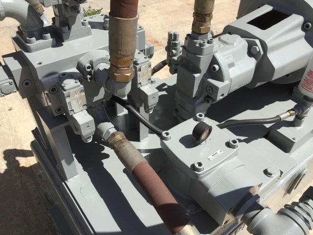 50 HP MOTOR (230/460 VOLTS; 1800 RPM). OILGEAR PRESSURE COMPENSATED PISTON PUMP (PVWH-45-LDFY-CNSNTH) RATED AT 43 GPM TO MAX 1500 PSI. OILGEAR FIXED VOLUME PISTON PUMP (PFWW-10-LSASNN) RATED AT 10 GPM THAT FLOWS THROUGH A FLOW METER; A THERMAL TRANSFER AIR COOLER (AOC-24-2-60) AND A SPIN-ON RETURN FILTER. ANOTHER ...more