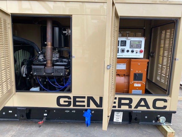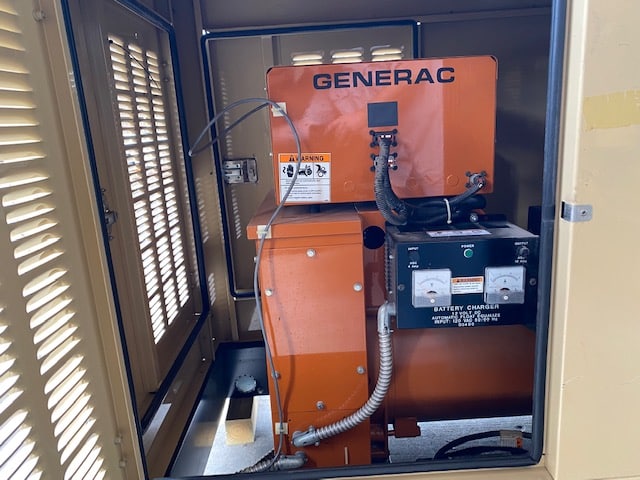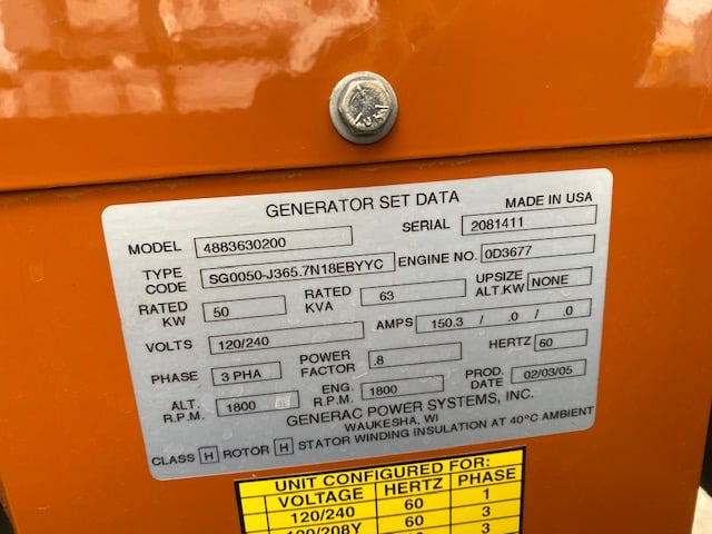 50 KW Generac #SG0050, Natural gas generator set, 120/240 Volts, 3-phase, 1800 RPM, GM 5.7L engine, weather protected enclosure, electronic governor, 2005