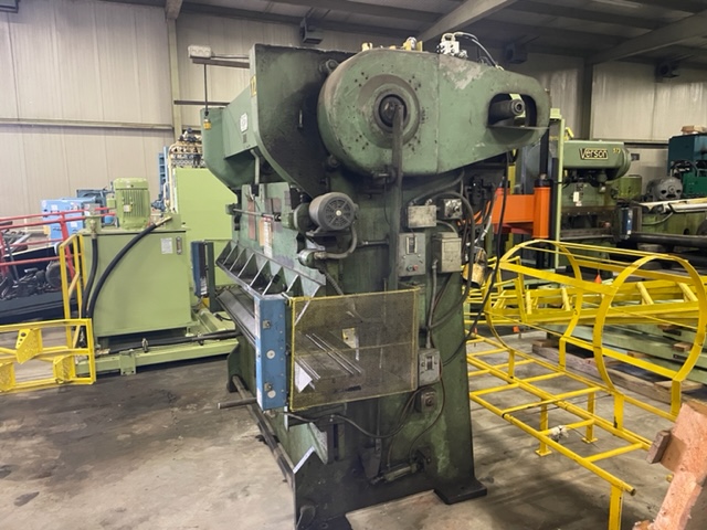 Size: 6L8-SP. Serial #L-4610. 12 GA mild steel. Table size: approx. 96" x 9". 3" stroke; 8.5" open; 3" power ram adjustment; 40 SPM. 16" light curtains and mesh guarding. Foot pedal operation. 5 HP motor (1800 RPM). Approx overall dimensions: 114" x 72" x 95" tall. Approx 10,500 pounds. Manual. Item #2716.