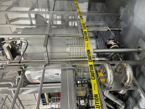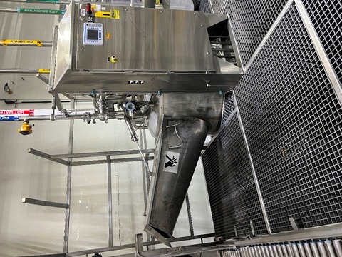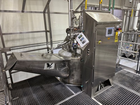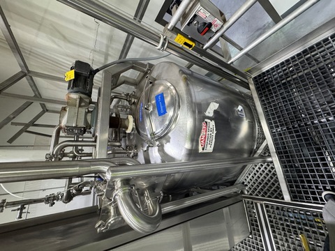 Feldmeier 500-gallon stainless steel jacketed juice chopper tank, Frozen Block Concentrate Chopper, Model A-910-02. Vessel measures approximately 5 diameter, built in 2003. Rated for 100 PSI jacket pressure and designed for thawing and blending frozen juice concentrate. ASME code constructed vessel. Unit includes side-mounted drum tilter for frozen drum loading, insulated jacket for controlled heating, and top-mounted agitator with multi-blade chopper assembly. Features stainless steel control panel with operator interface, sanitary connections, etc. Last used by major beverage manufacturer. Does not include mezzanine structure.