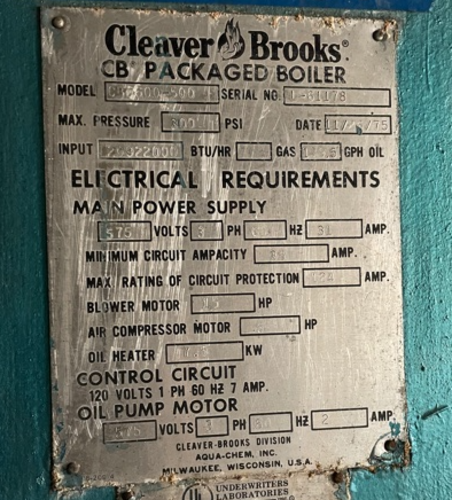 500 HP Cleaver-Brooks, Fire Tube Boiler, 300 psi, 575 V, 1975 Manufacturer: Cleaver-Brooks Year: 1975 HP: 500.00 Pounds per Square Inch: 300 Request a Quote 10 For Sale by C3 Surplus LLC Surplus Record Dealer Since 2020 Contact Seller Miami, FL Vernon Mccoy 305-42...> Show Seller's Phone Number 305-428-2777 Let the seller know you found their listing on Surplus Record! View More C3 Surplus LLC 's ListingsDescription Used Cleaver Brooks Steam Boiler, 17,250 steam lbs/hr, 20,922,000 BTU/hr, 500 HP, MAWP 300 PSI, Fuel No. 6 Oil Fired, Serial No L-61178, Boiler Weight Approx. 60,000 lbs, Built 1975, Older boiler but in good working condition!Cleaver Brooks 500 HP 300 PSI High Pressure Steam BoilerEquipment DescriptionManufacturer: Cleaver BrooksModel: CB-600-500Boiler Horsepower: 500 HPBoiler Type: Steam BoilerFuel Type: No. 6 Oil FiredDesign Pressure or Maximum Allowable Working Pressure: 300 PSIHeating Capacity: 20,922,000 BTU/hrSteam Capacity: 17,250 steam Lbs/hrYear Built: 1975Serial No: L-61178GPH Oil: N/AElectrical RequirementsMain Power SupplyVoltage: 575VPhase: 3 PHHertz: 60HzAmpacity: 31 AMPMinimum Circuit Ampacity: 45 AMPMaximum Rating of Circuit Protection: 124 AMPBlower MotorHorsepower: 15 HPAir Compressor MotorHorsepower: N/AOil Heater: N/AControl CircuitVolts: 120VPhase: 1 PHHertz: 60 HZAmpacity: 7 AMPOil Pump MotorVolts: 575VPhase: 1 PHHertz: 60HzAmpacity: 2 AMPOverall DimensionsLength: 20.33 ftWidth: 10.25 ftHeight: 10.5 ftBoiler Weight: 60,000 lbsLocation: North Carolina Request More Information from SellerGet Your Price from C3 Surplus LLC! "*" indicates required fieldsName*Company*Email* PhoneZip / Postal Code*QuestionMake an OfferRequests Send me a shipping quote I am interested in financingSend Copy Email me a confirmation of this inquiryBuyer Protection Use our partner Escrow.com to buy or sell equipment safelyBuyer Protection Send me info about buyer protectionThis field is hidden when viewing the formDealer Email Buyers Who Viewed This Listing Also Viewed … 500 HP Hurst #Series 400, Firetube Boiler, 3623 sq.ft., 150 psi, 17250 lb/hr, 2016Category: Firetube BoilersSeller: Revelation MachineryLocation: Chicago, IL Mfr: HurstModel: SERIESYear: 2016Make: Hurst, Model: Series 400, Year: 2016, Machine Location: Upon Request, Manufacturer: Hurst Boiler & Welding Co., Inc., Certification: ASME “S” stamped (power boiler), Max working pressure: 150 PSI, Heating surface: 3,623 sq. ft., Steam capacity: 17,250 lb/hr (approx. ...more 500 HP Hurst, Boiler System, 150 PSI, 3250 sq.ft. heat area, 2006Category: Firetube BoilersSeller: C3 Surplus LLCLocation: Miami, FL Mfr: HurstYear: 2006Overview, This 2006 Hurst 500 HP Boiler System is a comprehensive industrial steam generation package professionally repaired and certified by Hurst Boiler & Welding Co. in 2014. With a 150 PSI design pressure and 17,250 lbs/hr steam capacity, this system includes pollution control, ash removal system, complete ...more 500 HP Cleaver-Brooks #CB-400-500 CB packaged boiler, Natural gas, 15 psi, 460 Volts, 2008Category: Firetube BoilersSeller: Equipment Recovery CorpLocation: Willoughby, OH Mfr: Cleaver-BrooksModel: CB-400-500Year: 2008 500 HP Volcano, Steam Boiler, Natural Gas, High Pressure, 150 psiCategory: Firetube BoilersSeller: MachineCoLocation: Montreal, QCUsed: An item that has been used previously. The item may have some signs of cosmetic wear, but is fully operational and functions as intended. This item may be a floor model or store return that has been used. See the seller’s listing for full and of any imperfections., 500 HP, hi-Pres. gas-fired boiler ...more 500 HP Hurst, 250 psig, Gas, Low or Ultra Low NOx, newCategory: Firetube BoilersSeller: Nationwide Boiler IncLocation: Fremont, CA Mfr: HurstYear: 2024Share × "*" indicates required fieldsYour Name*Your Email* Recipient's Email* Note to Recipient