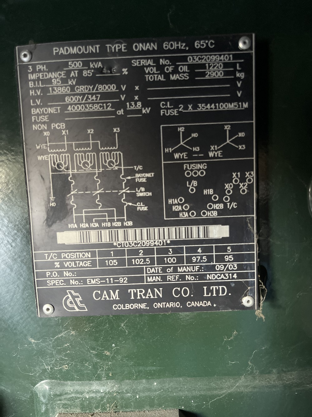 500 KVA 14400,13800,13200,12700,12470,12000,11700, taps High To Low Voltage Primary, 480Y/277 Wye Secondary