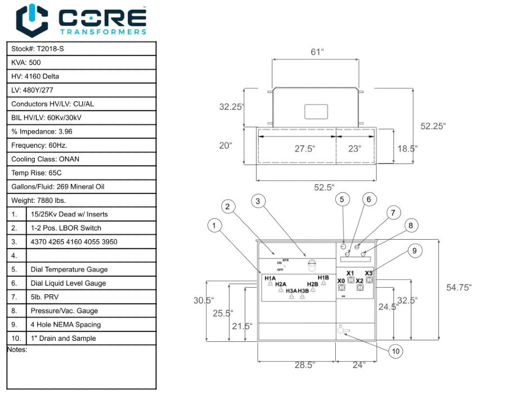 Year 2016 S/N C0031161 Condition Used ELECTRICAL kVA 500 kVA Primary Voltage 4160 volts Secondary Voltage 480 volts Phase 3-Phase Transformer Type Pad Mounted Transformer (Green) Auto VS Isolution Isolation Oil vs Dry Oil Oil Tank Size 950 L.
