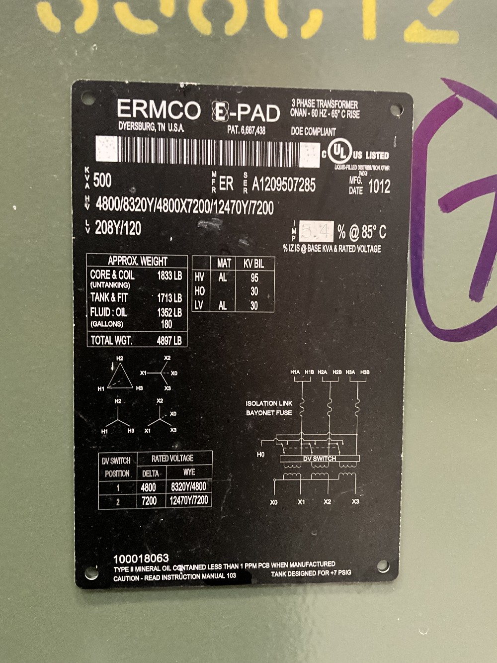 500 KVA 4800 Delta Primary, 480Y/277 Secondary, 3 phase Pad Mount Transformer