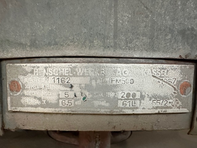 Used 500 liter Henschel high intensity mixer model FM500, serial number 078. New 1963. Non-jacketed mixer with 82/94 KW 2 speed motor, 220 volt. Stainless steel contact parts, no discharge valve, deflector blade included or motor starter., 1963 Henschel FM500, Bowl Volume (Capacity). 500 L, Motor Power. 8,294 hp ...more