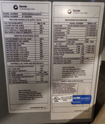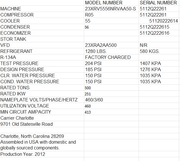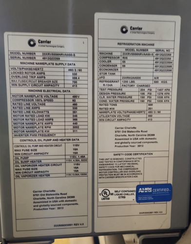 500 Ton, Carrier #23XRV5556NRAA50-S, Water-Cooled Chiller, R-134a, oil-free, R05 compressor, 2012