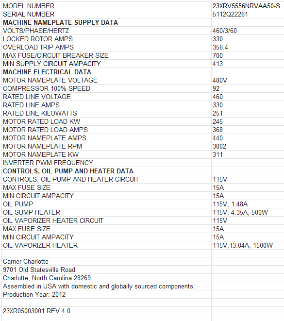 Overview, Available now is a Carrier 23XRV Series Water-Cooled Centrifugal Chiller, model 23XRV5556NRAA50-S, with high-efficiency, oil-free magnetic bearing technology. Manufactured in 2012, this chiller is an excellent fit for commercial HVAC systems requiring reliable, large-capacity cooling., Technical, - Model: ...more