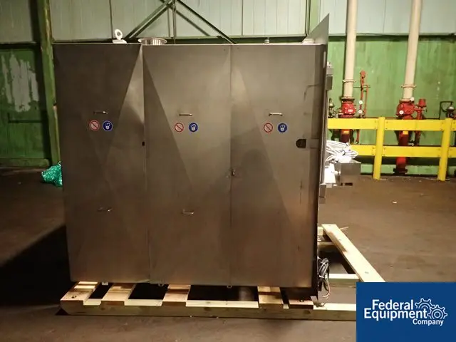 Used Lot of (2) Vector coating pan, model VHC-130STL, stainless steel construction, 52" diameter perforated pan, solvent rated explosion proof design, nominally rated 112-210 liter volume, 157 kg capacity with spray guns, 3 hp pan motor, 460 volt with HMI, Buffalo air handling unit, steam heated with blower, Vector ...more