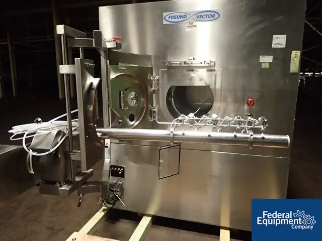 used- vector hi coater model hcf-130 tablet coater. stainless steel. 52" diameter drum with (4) rows of perforations and (4) baffle plates. automatic trap door for emptying and cleaning the pan. the pan is included. drum rotates 4-16rpm. manifold spray bar. batch input capacity 120-140kgs. batch coated product output ...more