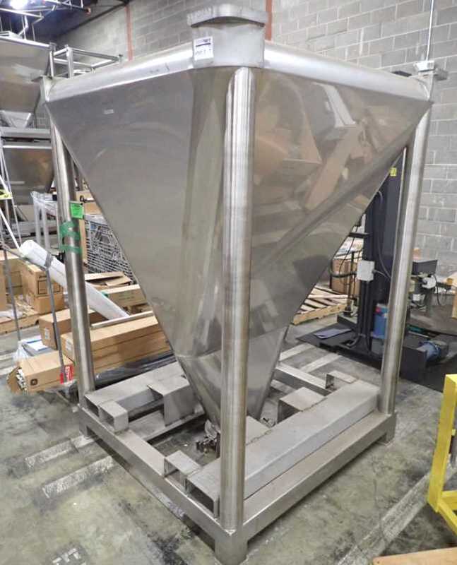 Bin, 50 CF, stainless steel, 46" X 41" X 43", Tote, (18). (18) Tote bin, tank, approximately 375 gallon capacity, 50 CF, constructed of stainless steel, 46-1/2" wide x 41-1/2" long x 43-1/2" straight side, cone bottom, 24" diameter center top opening, 10" diameter center bottom outlet, material handle division, "tote ...more