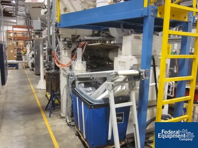 Used 54" Welex 5 layer sheet line consisting of the following: Mcguire blender feeder (1) 3.5" Welex extruder, 36:1 l/d, vent with dc motor and screen changer. (2) 2.5" Welex extruders, 30:1 l.d with dc motors (1) 2" Welex extruder, 24:1 l/d with dc motor. (1) 1.25" Welex extruder, 24:1 l/d with dc motor. (1) Welex Co-Ex die block. (1) 53" EDI flex lip sheet die with R bar. (1) Welex vertical sheet stack with (3) 18" diameter x 54" roll faced cored rolls with rotary units, high polished rolls. (1) NEC thickness guage. (1) Cooling conveyor. (1) Welex Pull roll stand with rubber nip roll. (1) Welex Shear. (1) Welex two position winder. System set up for 5 layer, Welex Co-Ex block capable of 7 layers, producing a sheet 10 mil - 150 mil thick at 700#/hour.
