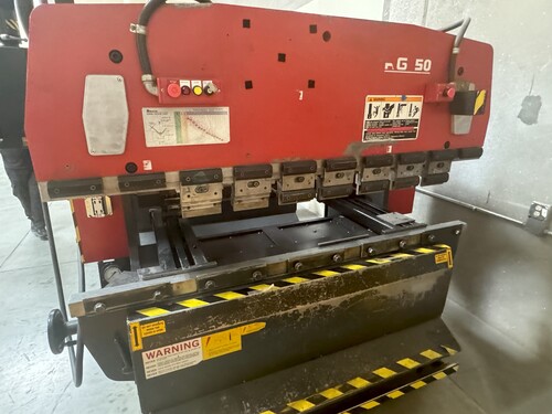 Amada RG-50 CNC Press Brake With NC9-EXII Control.:Capacity 50 tons -US Tons 55Max. bending length 82.1"Table length 78.8"Distance between uprights 59.9"Throat depth 15.76"Length of stroke 3.94"Open height 14.58"Ram repeatability +/-.0004"Back gauge travel 19.6"Approach speed 106 ipmBend speed 2-19 ipmReturn speed 122 ...more