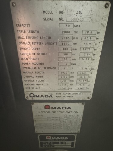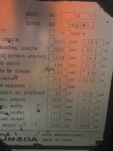 SERIAL. 506302, MODEL. RG-50, CAPACITY. 50 TON, BED LENGTH. 78.8", DISTANCE BETWEEN FRAME. 82.1", THROAT DEPTH. 15.76", STROKE. 3.94", OPEN HEIGHT. 14.56", CONTROL. AMADA NC9-EX, BACK GAUGES. YES.