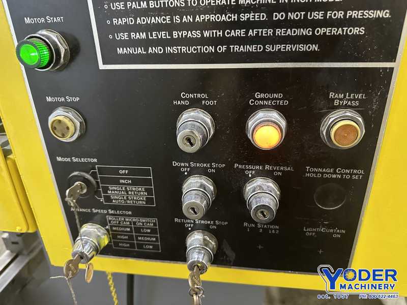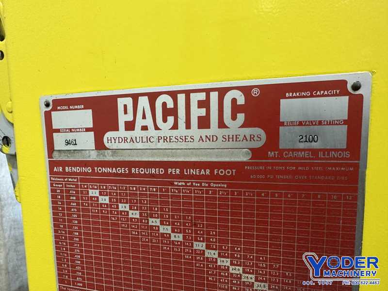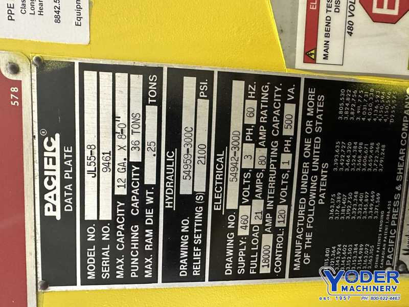 SERIAL.: 6919, MODEL.: J55-8, TONNAGE.: 55 TON, LENGTH OF BED.: 96", DISTANCE BETWEEN HOUSINGS.: 78", STROKE.: 6", INCH.: YES, RAM SPEED APPROACH RAPID.: YES, RAM SPEED FORMING.: YES, RAPID RAM RETURN.: YES, DWELL ON BOTTOM.: YES, WEIGHT: 8,500 LBS, Machine Type.Brakes, Press Manufacturer.PACIFIC Model.J55-8 Year.1985 ...more