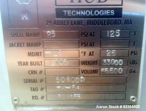 55500 gallon, HUB Technologies, Horizontal Pressure Tank, 316L Stainless Steel, dished top & bottom, saddles, 13' diameter x 68' straight side, 2005 Year: 2005 Gallons/Liters: 55500.0 Stock # 52384003 Request a Quote 9 For Sale by Aaron Equipment Co Surplus Record Dealer Since 2024 Contact Seller Schaumburg, IL Ken Matuszak 708-41...> Show Seller's Phone Number 708-412-6077 Let the seller know you found their listing on Surplus Record! View More Aaron Equipment Co 's ListingsDescription used- hub technologies 55,500 gallon horizontal pressure tank. 316l stainless steel, dished heads, tank on (2) saddles, end swing arm manway cover. approximately 68' long x 14' tall x 13' wide. shell rated 25/-0.75 psi at 125 degrees f. 33,000 empty weight. Request More Information from SellerGet Your Price from Aaron Equipment Co! "*" indicates required fieldsName*Company*Email* PhoneZip / Postal Code*QuestionMake an OfferRequests Send me a shipping quote I am interested in financingSend Copy Email me a confirmation of this inquiryBuyer Protection Use our partner Escrow.com to buy or sell equipment safelyBuyer Protection Send me info about buyer protectionThis field is hidden when viewing the formDealer Email Buyers Who Viewed This Listing Also Viewed … 55500 gallon, HUB Technologies, Horizontal Pressure Tank, 316L Stainless Steel, dished top & bottom, saddles, 13' diameter x 68' straight side, 2005Category: Stainless Steel Tanks and VesselsSeller: Aaron Equipment CoLocation: Schaumburg, ILYear: 2005used- horizontal 55,500 gallon pressure tank, manufactured by hub technologies. 316l stainless steel, dished heads, tank on (2) saddles, end swing arm manway cover. approximately 68' long x 14' tall x 13' wide. shell rated 25/-0.75 psi at 125 degrees f. 33,000 empty weight.JUST ADDED! 31372 gallon, M Roth GmbH, Storage Tank, 304 Stainless Steel, 153.5" ID x 334" straight side, dish top, cone bottom, 2014 (8 available)Category: Stainless Steel Tanks and VesselsSeller: Federal Equipment CompanyLocation: Cleveland, OHUsed 118,745 liter (31,372 gallon) M Roth GmbH storage tank, 304 stainless steel construction, approximately 3,900mm (153.54") inner diameter x 8,500mm (334") straight side, dish top, 55 degree cone bottom, approximately 2,400mm (94.48") deep, rated 0.9 bar at 40°C internal, jacketed cone and 196" of straight side ...more 74500 gallon T. Bailey, 316L Stainless Steel tank, 58' tall, 16' diameter, 2018Category: Stainless Steel Tanks and VesselsSeller: Global Equipment InternationalLocation: Chalfont, PA Mfr: T BaileyYear: 2018Manufacturer T BAILEY Model TANK Condition Used Stock Number 904301.040. 30000 gallon Palmer #2-TK-2015, water recovery surge tank, 12' diameter, 35' straight side, SA-36, 1/16" corrosion allow, 2007Category: Stainless Steel Tanks and VesselsSeller: C3 Surplus LLCLocation: Miami, FL Mfr: PalmerYear: 2007Overview, This used 30,000 Gallon Water Recovery Surge Tank manufactured by Palmer MFG & Tank Inc. is designed for industrial water recovery and surge capacity applications. Built in 2007, this atmospheric pressure tank provides substantial storage capacity for water/acid recovery systems with corrosion-resistant ...more Alloy Products Corp., Pressure Vessel, 100 psi,. 250 FCategory: Stainless Steel Tanks and VesselsSeller: EcReCon Inc.Location: Pedericktown, NJ Mfr: Alloy ProductsYear: 1990, Alloy Product Corp. 100 PSI Max W.P. 250 F. Min. Temp. -20 F. 100 PSI. Serial# 84906-225. Pressure Vessel., 1990 ALLOY PRODUCTS CORP., Gallons. 0 gal, PSIG. 100, ID - Inches. 0 in, Temp (F). 250, Material. T-316, Vert/Horiz. V.Share × "*" indicates required fieldsYour Name*Your Email* Recipient's Email* Note to Recipient