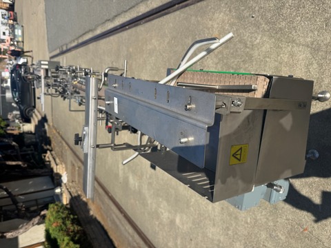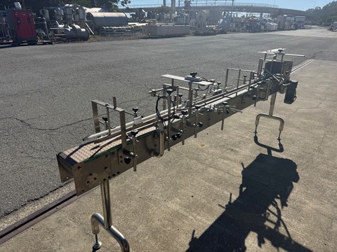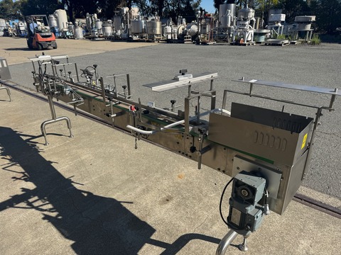 Stainless steel belt conveyor, measures 6" wide x 10' long, includes stainless steel belt and stainless steel frame with legs. Belt is driven by 1 HP, 208-230/460V, 1725 RPM, 6/60 Hz motor thru gear reducer and chain & sprocket assembly. Includes emergency stop switch. Previously used to convey cans at food ...more