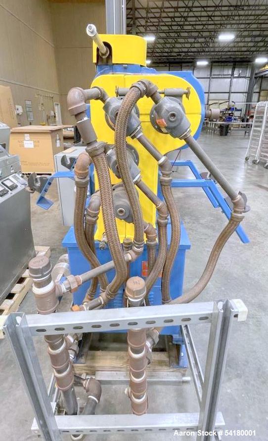 TROY ENGINE & MACHINE CO. MACHINE # R-2098. 4" X 8" CORED ROLLS WITH MANIFOLD AND INDIVIDUAL SHUT-OFFS. CHROME ROLLS. ADJUSTABLE END-GUIDES. ADJUSTABLE ROLLS. APPROX 42" CENTER-LINE (ON 24" TALL TABLE). 220/440 VOLT MOTOR (900/750 RPM). E-STOP (CHAIN). OVERALL APPROX DIMENSIONS: 34" X 26" X 52" TALL. APPROX 350 ...more