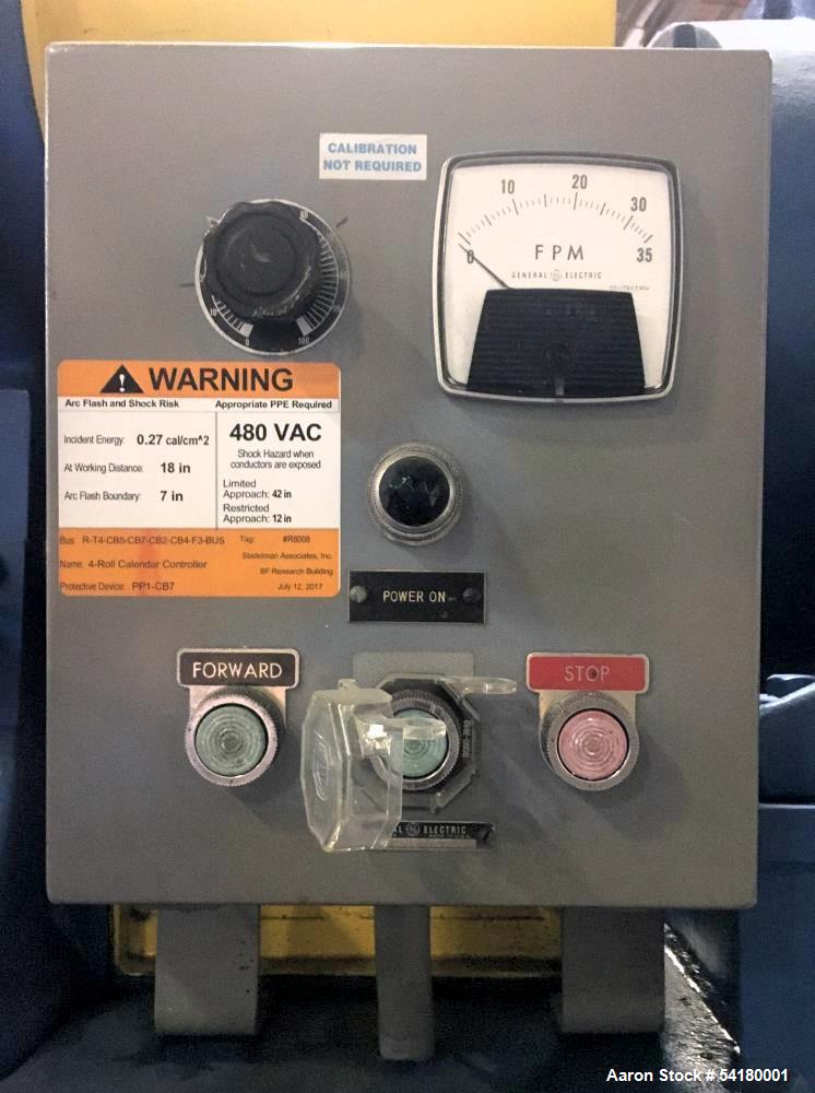 used- farrel 4-roll inverted "l" rubber/plastic laboratory calendar mill. 6" d x 13" l rolls. 500 degrees f max. roll temp. up to 35 rpm. fixed center roll w/ adjustable bottom, top, and offset. full herringbone even speed gears on one side, full herringbone friction gears on the other side. nylon adjustable infeed guides. (2) adjustable twin knives on bottom roll. cable safeties on both sides of frames. scr drive w/ dynamic braking; operators control station with variable speeds. variable speed 7.5 hp motor. 3/460v. serial# 73a1499.
