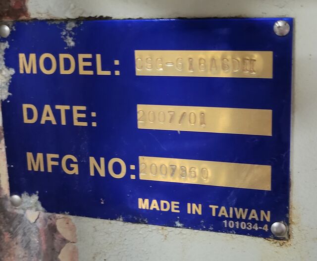Spec Sheet: The 2007 Clausing CSG-618ASD II is a precision 6" x 18" hydraulic surface grinder designed for high-accuracy grinding tasks. Based on technical data for the Clausing/Equiptop 618 series, the specifications are as follows: Capacity and Table Table Size: 6" x 18" (152 x 460mm) Longitudinal Table Travel (Hydraulic): 18.9" - 20" (480mm - 510mm) Crossfeed Travel (Manual/Auto): 7" - 7.68" (178mm - 195mm) Maximum Distance (Table to Spindle Center): 18" (460mm) Magnetic Chuck Size: 6" x 18" Spindle and Motor Spindle Motor: 2 Hp, 3450 RPM (60Hz) Spindle Type: Cartridge-type supported by preloaded angular contact ball bearings Hydraulic Motor: 1 Hp Vertical Rapid Feed Motor: 40W (standard on ASD models) Grinding Wheel Diameter: 8" (203mm) Width: 0.5" - 0.75" (12.7mm - 19mm) Bore: 1.25" (31.75mm) Movement and Precision Vertical Handwheel Graduation: 0.0001" (0.005mm) Vertical Handwheel Revolution: 0.05" (1mm) Crossfeed Handwheel Graduation: 0.0005" (0.02mm) Crossfeed Handwheel Revolution: 0.2" (5mm) Longitudinal Table Speed: Infinitely variable, 196-984 in/min Construction and Dimensions Ways: Hand-scraped V and Flat ways, with Turcite-B coating on table ways Weight: Approx. 1,808 lbs (820 kg) Dimensions (L x W x H): 71.3" x 44.6" x 65.4" Standard Features Automatic lubrication system Table-mounted diamond dresser Grinding wheel and flange Balancing stand with arbor Hydraulic-driven longitudinal table movement Servo motor-driven crossfeed