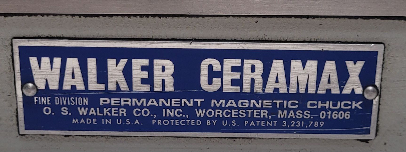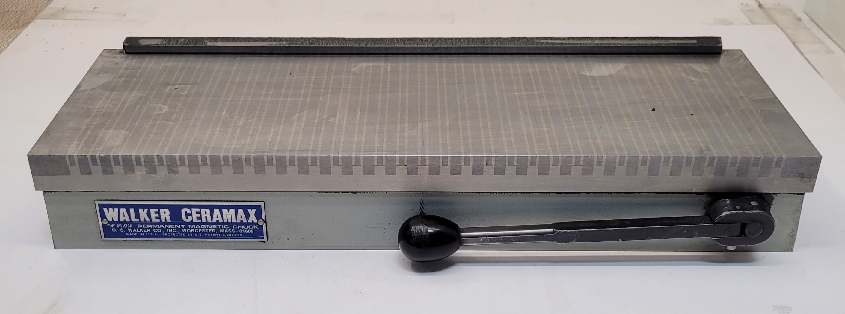 O.S. Walker Co. 6" x 18" used Permanent Magnetic Chuck for sale. Ideal for tooling needs, this Ceramax model offers reliability and precision. Dimensions: 6in x 18in. US Patent 3,231,789. Professional-grade accessory, ready for your workshop.