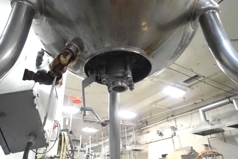 Lee, Model 225LD, 225 liter 316 stainless steel jacketed kettle. Vessel Dimensions: 32" diameter x 24" deep with a 10" straight wall. prop agitation powered by a ¼ hp drive, flip up cover and 1½" tri-clamp center bottom discharge with ball valve and 15" ground clearance. Mounted ...more