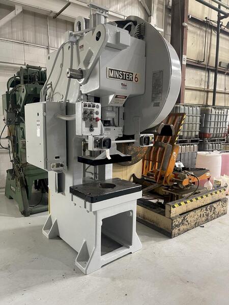 60 Ton, Minster #6SS, OBI flywheel press, 5" stroke, 14.5" Shut Height, 2.75"ram adj., 90 SPM, 32" x21"bed, air clutch & brake, 1994