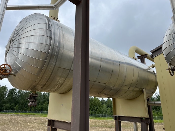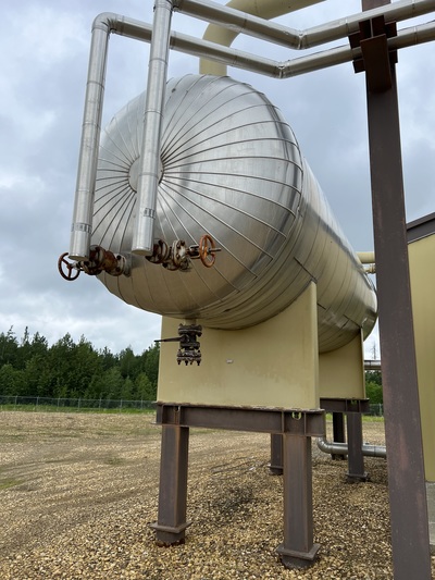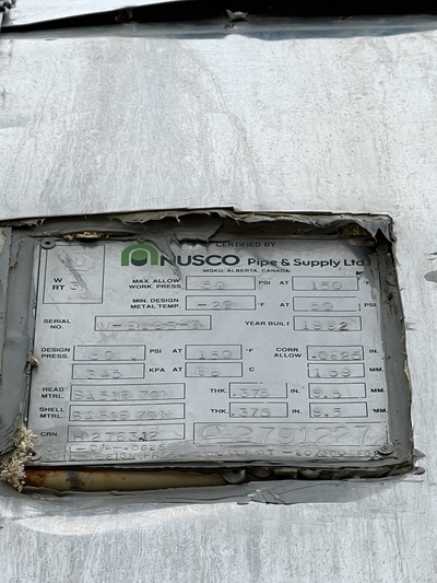 For sale: A non-portable, non-housed horizontal vessel manufactured by Nusco in 1992. The vessel features a capacity of 70 barrels (BBL) and operates at a pressure of 50 PSI. It comes with dimensions of 60 inches in diameter and an overall length of 18 feet. Operational status is connected; however, it does not include a warranty. Located in Dawson Creek, BC, Canada. Please note that the barrel calculations should be verified.