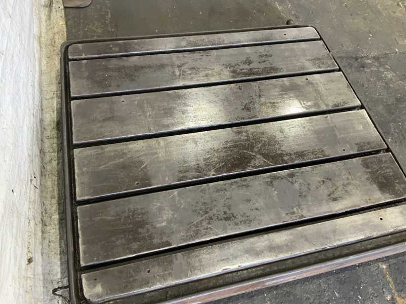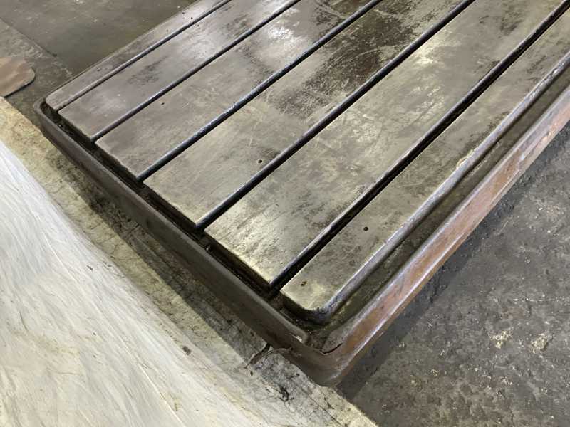 WIDTH - 60", LENGTH - 96", THICKNESS OF PLATE -7", HEIGHT OF PLATE WITH LEGS - 31", # OF T SLOTS - 8, T SLOT CENTERS - 6" & 9", T SLOT DIMENSIONS, DEPTH - 2", WIDTH AT TOP - 1", WIDTH AT BOTTOM - 2", APPROXIMATE WEIGHT 10,000 LB.