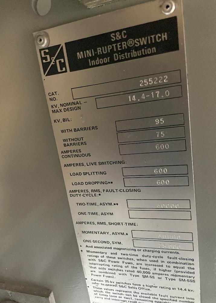 600 Amp S&C 17 KV Load Interrupter Switch N1