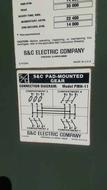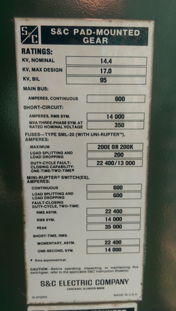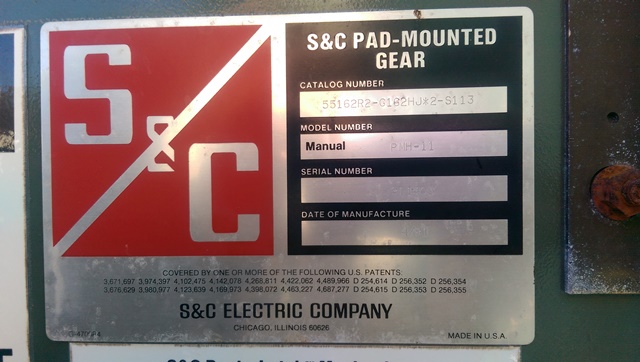 Stock #DS13, S&C Pad mounted gear type PMH-7, Cat# 55532R3-B6C3-E103 Serial no. 002416 with mounting pad. KV nominal 14.4 KV m Max 17 kv, 600 amps continuous, fuse 600 amps, rms sys 20 ka, 500 mva, peak sym 50 ka Date 07/00. Made in USA, Shipping size: 60” L x 64” W x 60” H 2200 lbs.