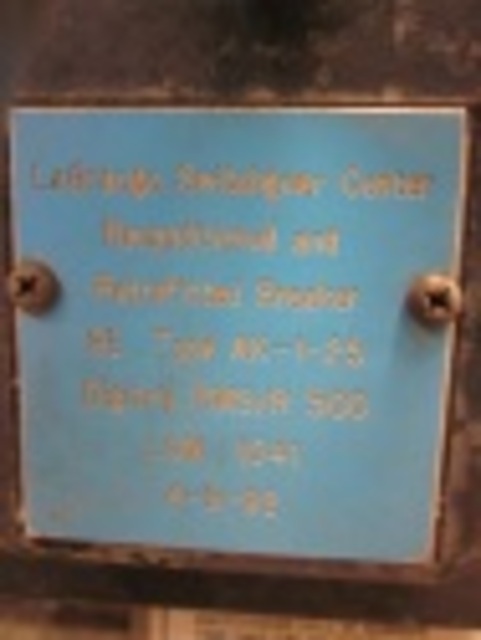 General Electric Circuit Breaker, Air Breakers type, Catalog Number AK-1-25, 600 amp frame current, 600 volts, Manual operation, Drawout mounting