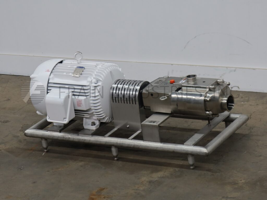 Waukesha, Model 130UTS, positive displacement twin screw pump with 316 stainless steel contact parts. Rated from 1 to 300 gallons of product per minute with current screw pitch and capable of up to 600 gallons per minute – depending on materials, application and machine configuration. 375 psi maximum working pressure, temperature range of -40° F to 300° F. Equipped with 4¾" OD / 4" ID Tri-Clamp style product charge with 11" ground clearance and 3"OD / 2½"ID top discharge with a 20" discharge height. Powered by 15 Hp motor drive for a current rate of 105.6 gallons per minute.
