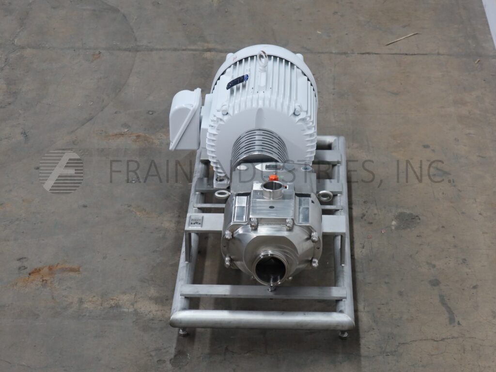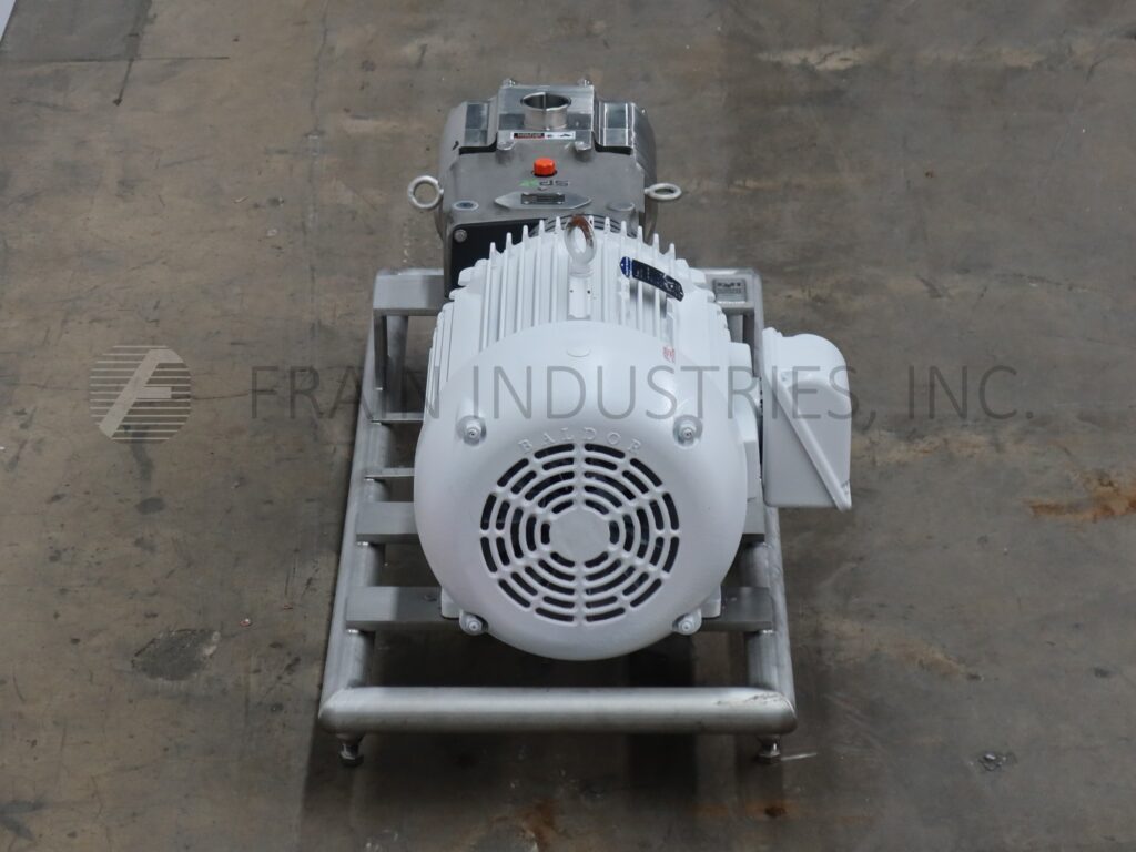 Waukesha, Model 130UTS, positive displacement twin screw pump with 316 stainless steel contact parts. Rated from 1 to 300 gallons of product per minute with current screw pitch and capable of up to 600 gallons per minute – depending on materials, application and machine configuration. 375 psi maximum working pressure, temperature range of -40° F to 300° F. Equipped with 4¾" OD / 4" ID Tri-Clamp style product charge with 11" ground clearance and 3"OD / 2½"ID top discharge with a 20" discharge height. Powered by 20 Hp motor drive for a current rate of 105.6 gallons per minute.