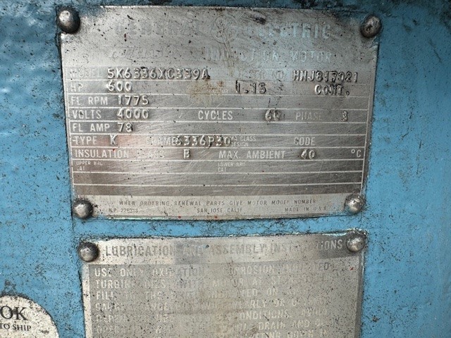 600 HP 1775 RPM General Electric, Frame 6328P24, weather protected enclosure type 1, HT, 2300/4000 Volts