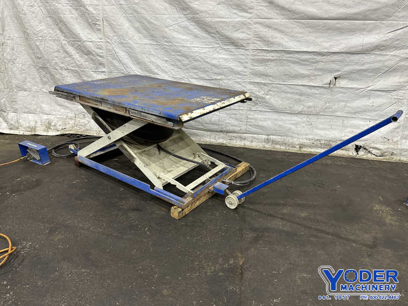 CAPACITY. 6000 LBS, LENGTH OF TABLE. 63", WIDTH OF TABLE. 41":, TABLE HEIGHT LOWERED. 5", TABLE HEIGHT RAISED. 36", EXTENSION ARM. 4, LENGTH OF ARMS. 15", FOOT PEDAL. PNEUMATIC.