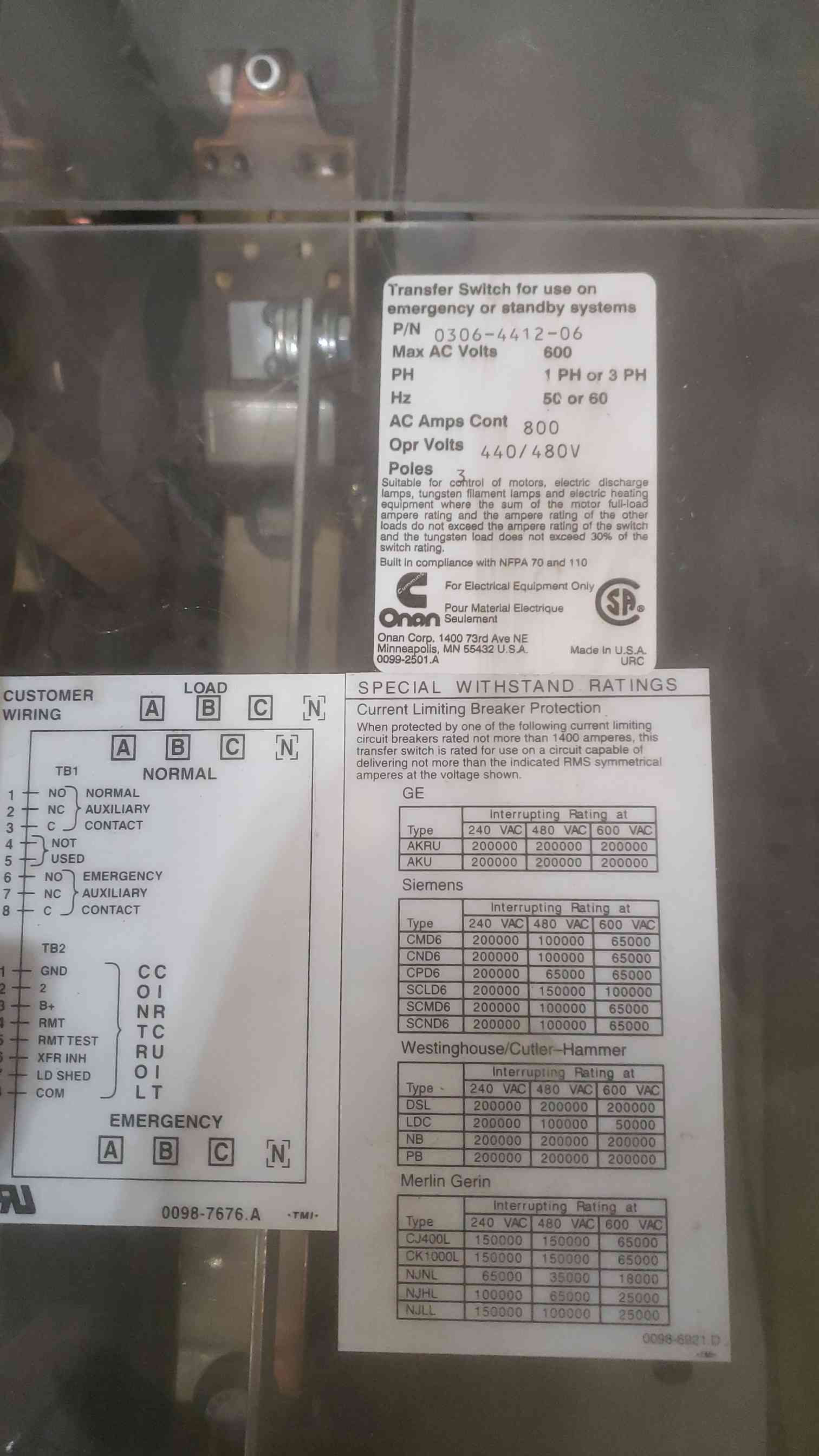 600 Amp, ASCO, automatic transfer switch, 208 Volts, 3PH