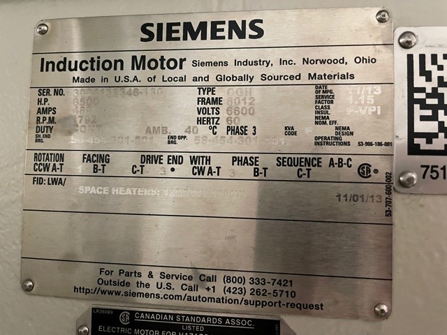 6500 HP 1792 RPM Siemens, Frame 8012S, weather protected enclosure type 2, SB, 1.15 service factor, 4160/6600 Volts, new surplus (16 available)